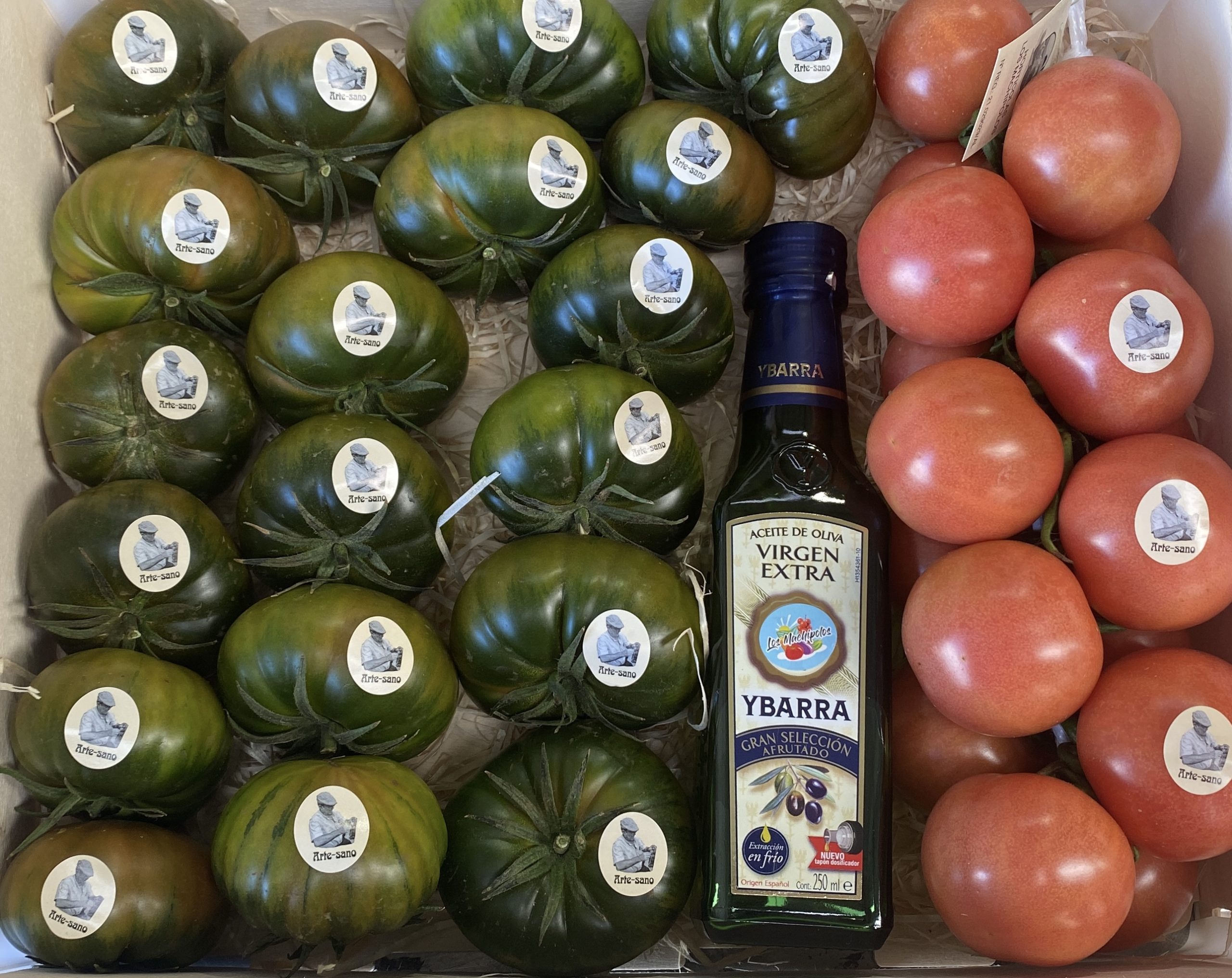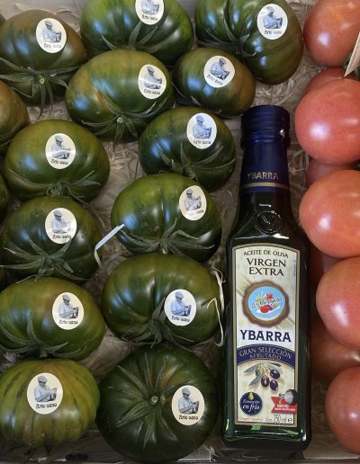 Si no sabes que elegir, te presentamos la «CAJA MIXTA». Trae una ristra de nuestro tomate de penjar, una botellita de aceite y dos kilos de tomate Raf negro.